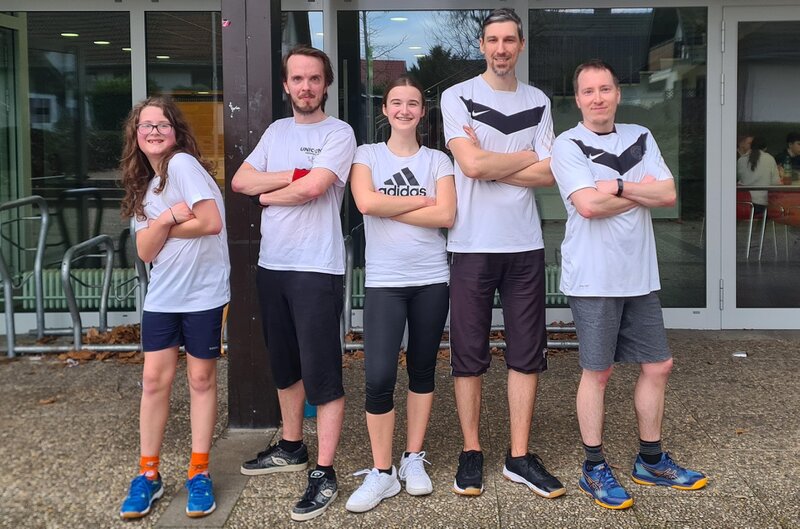 Foto: Die Athleten des VR Münster. Hinten: Jana Danz, Frank Hoffmann, Stefan Grimm, Carsten Schmidt Vorne: Melina Schwalbe, Tristan Lück, Nepomuk Sterkel