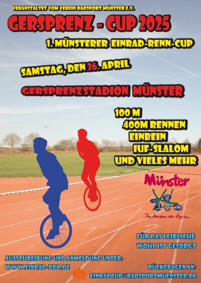Anlass hierfür ist vor allem der Gersprenz Cup, der am Samstag, den 26. April im heimischen Stadion stattfinden wird. Dabei handelt es sich um den 1. Münsterer Einrad-Renn-Cup. Es werden Wettbewerbe in verschiedenen Disziplinen - ähnlich der Leichtathletik – ausgetragen, wie zum Beispiel im Rennen, Springen sowie Geschicklichkeitsfahren. Zuschauer sind herzlich willkommen, für das leibliche Wohl ist bestens gesorgt. Der Eintritt ist frei, Start ist um 10:00 Uhr.