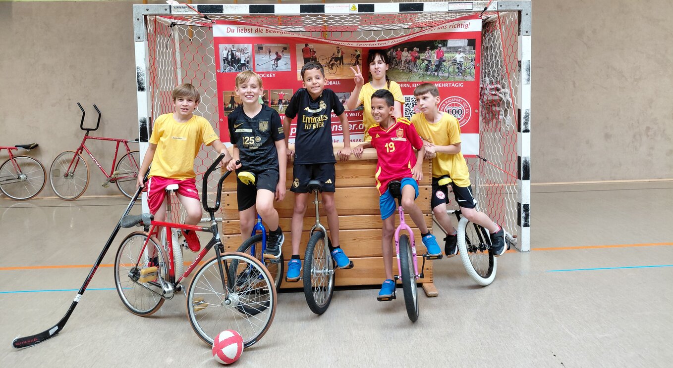 23.07.2025 Bei den Ferienspielen in Eppertshausen nahm, wie schon im letzten Jahr, wieder der VR Münster teil. Sechs Mädchen und Jungen zwischen 8 und 13 Jahren versuchten sich im Einradfahren und testeten ihr Können auf Radballrädern. Dabei mussten sie feststellen, dass Letztere zwar fast genauso aussehen wie ihre eigenen Fahrräder, trotzdem aber viel schwieriger zu fahren sind. Einige schafften es trotzdem, mit dem Vorderrad auch noch einen Ball zu schießen. Auch beim Einradfahren waren nach fleißigem Üben schon erste Erfolge zu erkennen.