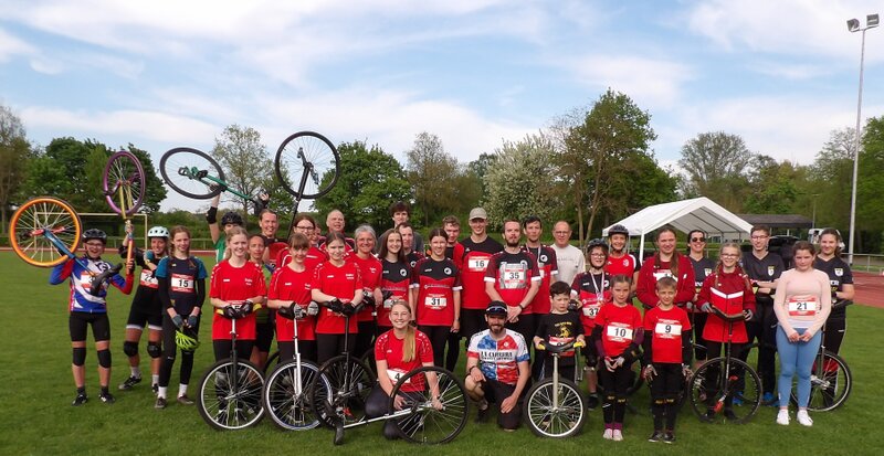 14.04.2025 Am 13. und 14.09. fanden in Bottrop die Deutschen Meisterschaften im Einrad Rennen statt und wie schon bei der Bayrischen Meisterschaft im Juni war auch diesmal ein Team des VR Münster mit am Start. Unter Führung des erfahrenen Carsten Schmidt sammelten Nepomuk Sterkel, Tristan Lück und Rebecca Sterkel weitere Erfahrung. Vor allem Carsten Schmidt und Tristan Lück starteten unter erschwerten Bedingungen, da ihre Altersklasse (U40) mit den jüngeren U30 Fahrern zusammengelegt wurde. Trotzdem erreichte Schmidt über 100m, 200m, 400m, 800m und im Slalom den Finallauf der Männer und konnte sich über 800m in einem spannenden Rennen den 2. Platz sicher. Nepomuk Sterkel schaffte es über 200m, 800m und im Slalom in den Endlauf der männlichen Junioren und gewann mit einer starken Leistung im Slalom Bronze und über 200m Silber. Tristan Lück und Rebecca Sterkel konnten zwar keine Plätze auf dem Treppchen ergattern, feierten aber trotzdem persönliche Erfolge. So konnten beide ihren ersten Einbeinlauf, bei dem es immer wieder zu Stürzen kommt, erfolgreich beenden.