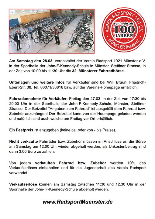 Unterlagen und weitere Hinweise für Verkäufer sind ab sofort auf der Vereins-Homepage (www.radsportmuenster.de) unter dem Reiter „Aktivitäten“ erhältlich. Außerdem können Sie diese bei der Fahrrad Annahme bekommen.